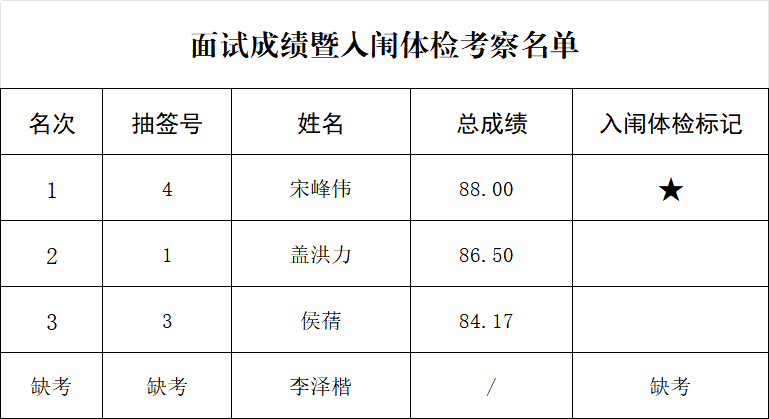 一、面试成绩暨入闱体检考察名单(详见附件)。